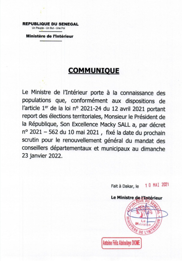Dans un communiqué publié par le Ministre de l’Intérieur, il est annoncé que, conformément aux dispositions de l’article 1er de la loi n° 2021-24 du 12 avril 2021 portant report des élections territoriales, Monsieur le Président de la République, le Chef de l’Etat Macky SALL a, par décret n° 2021 – 562 du 10 mai 2021, fixé la date du prochain scrutin pour le renouvellement général du mandat des conseillers départementaux et municipaux au dimanche 23 janvier 2022.