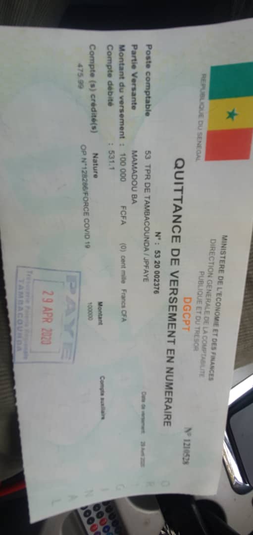 « Ces 100.000f constituent l’appui de la section Pds de Tambacounda, à l’élan de solidarité qui veut que toutes les couches de la société participent au combat afin d’éviter la propagation de la maladie. C’est ainsi qu’au nom du parti, je me suis acquitté la mission d’aller verser la somme au trésor public de Tamba (le mercredi 29 avril 2020) », précise Mamadou Bâ.