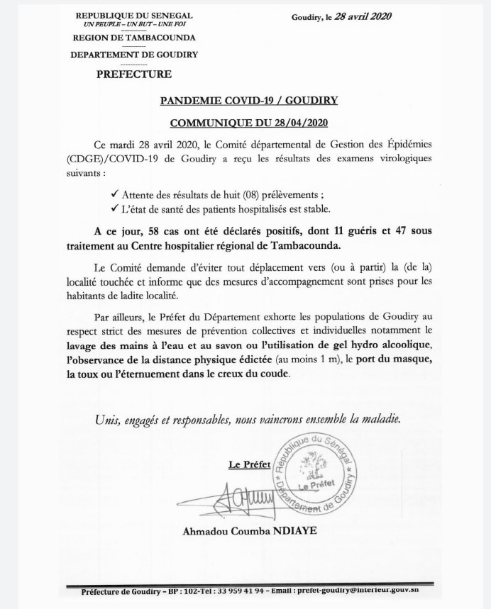 Dans un communiqué du Préfet de Goudiry signé ce mardi 28 avril 2020, il est indiqué que ce département a enregistré depuis le 2 avril jusqu’à ce jour mardi, 58 contaminations au Coronavirus.