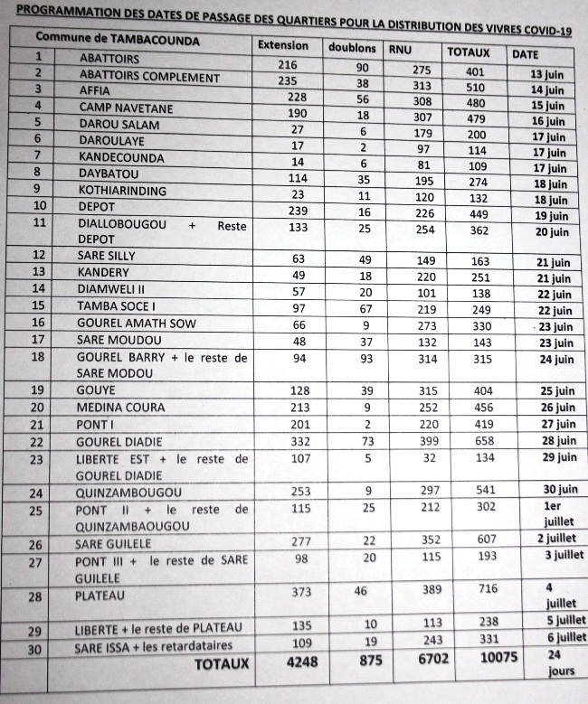 Sur proposition de la municipalité de Tambacounda, le Préfet du département, Mame Less Cabou a validé le calendrier de distribution de l’aide alimentaire du Gouvernement du Sénégal aux ménages impactés par la Covid-19.